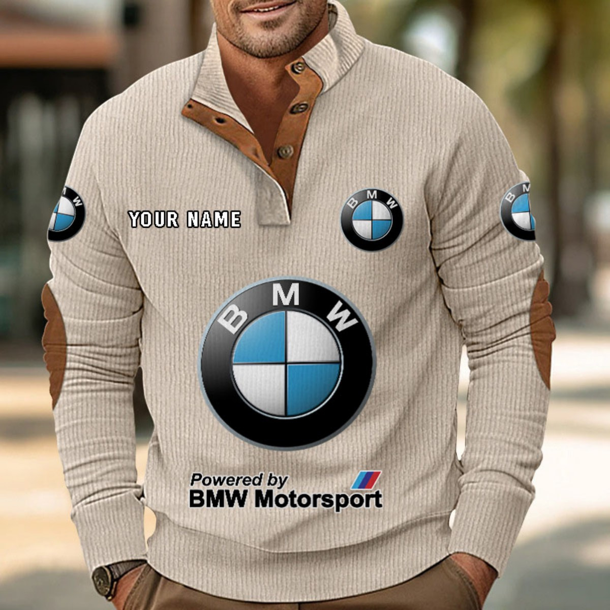 Doté d’un col montant, d’une patte de boutonnage partielle et de détails raffinés comme des empiècements en suédine au col et aux coudes,