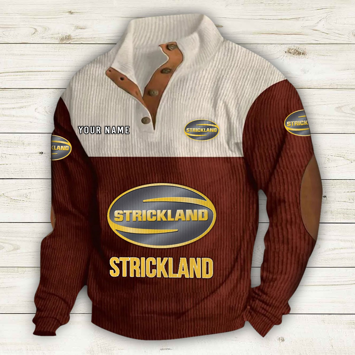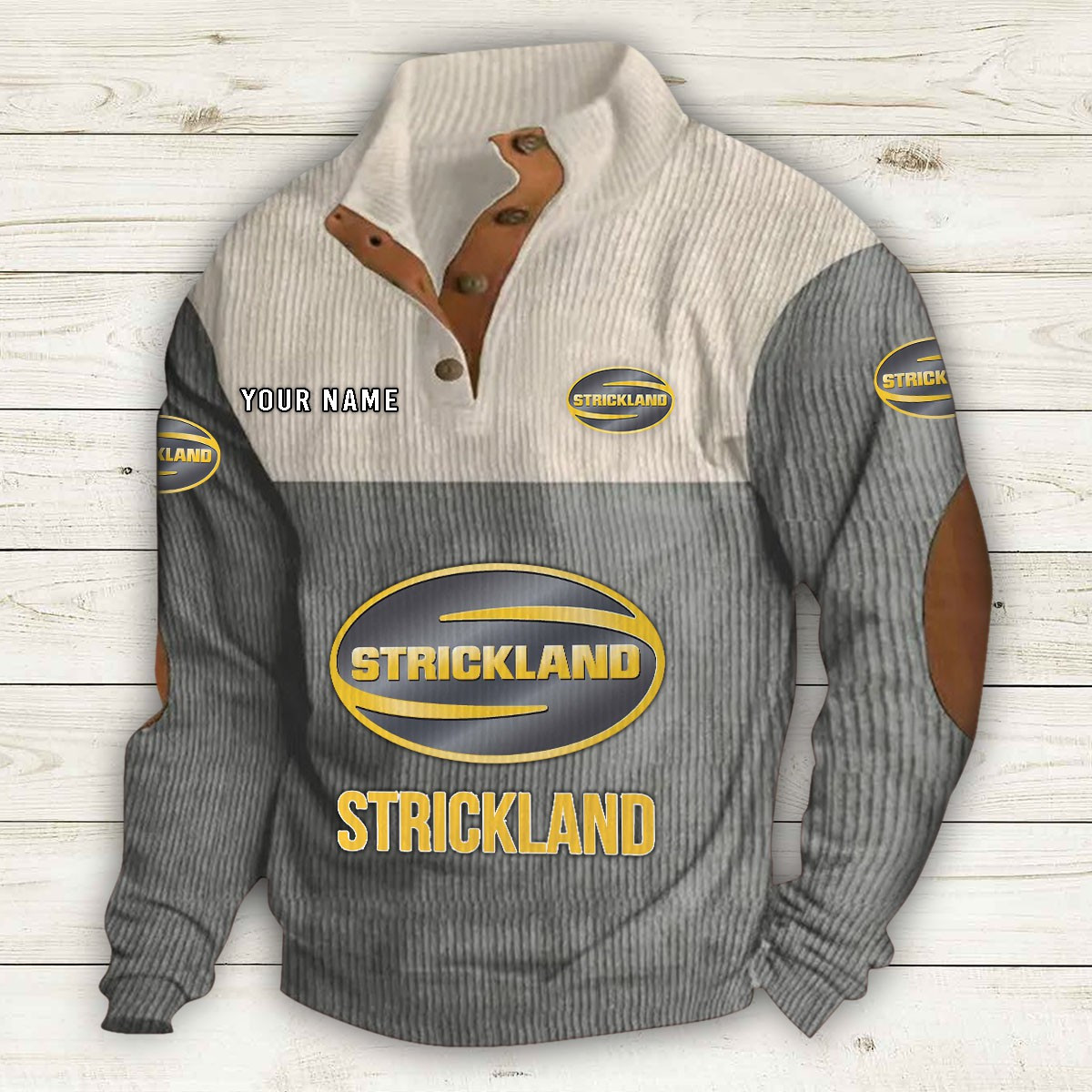 Col montant avec patte de boutonnage, empiècements en suédine au col et aux coudes, poche kangourou et boutons métalliques de qualité.