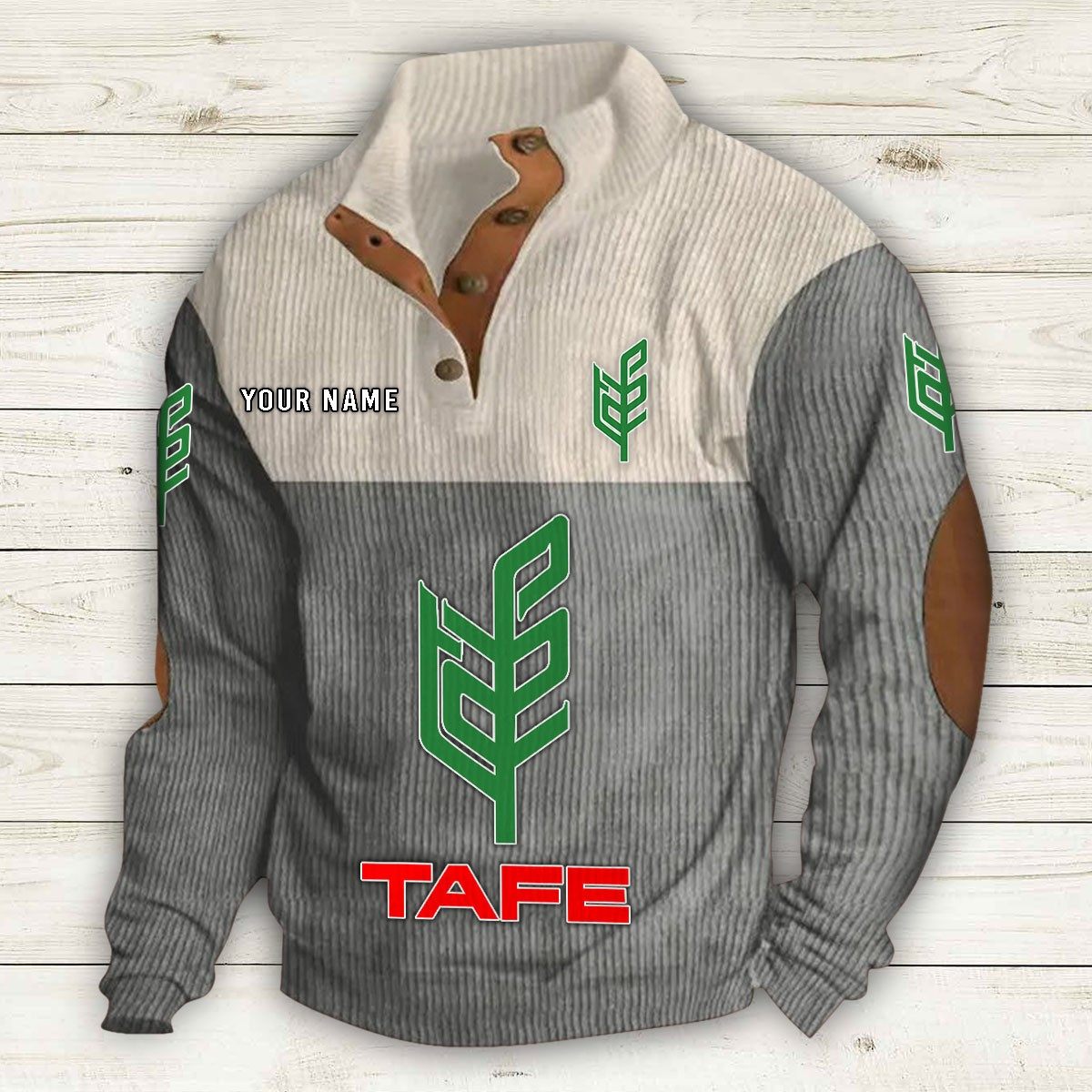 Col montant avec patte de boutonnage, empiècements en suédine au col et aux coudes, poche kangourou et boutons métalliques de qualité.